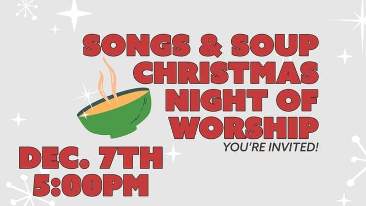 Join us on Sunday evening, December 7th beginning at 5:00pm as we gather for a time of worship in the RCC Sanctuary. Afterward we will enjoy fellowship and soup in the Connections Cafe. Bring a soup to share.